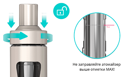 Открутите верхнюю крышку (5) (рис.1) и заправьте атомайзер жидкостью. Устройство оснащено специальным механизмом защиты от детей. Для того, чтобы открыть крышку, необходимо нажать и отвернуть ее против часовой стрелки.