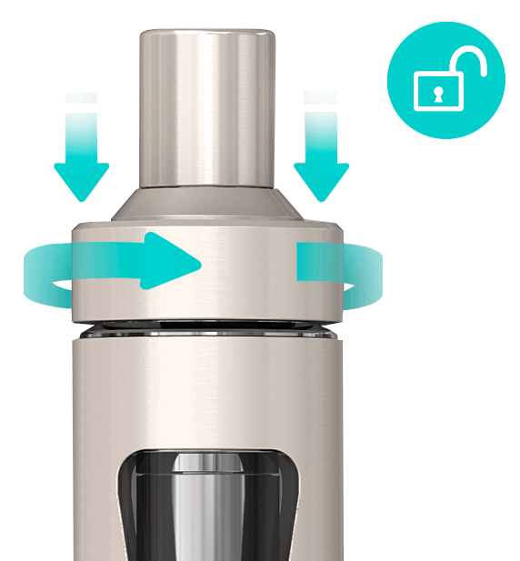Чтобы заменить испаритель, открутите верхнюю крышку. Устройство оснащено специальным механизмом защиты от детей. Для того, чтобы открыть крышку, необходимо нажать и отвернуть ее против часовой стрелки. Выкрутите испаритель из верхней крышки и замените на новый. Примечание: Не промывайте испаритель водой.